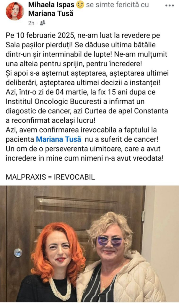 „Azi, la 15 ani după ce Institutul Oncologic București a infirmat diagnosticul de cancer, Curtea de Apel Constanța a reconfirmat același lucru! MALPRAXIS = IREVOCABIL”, a scris avocata Mihaela Ispas într-o postare emoționantă.